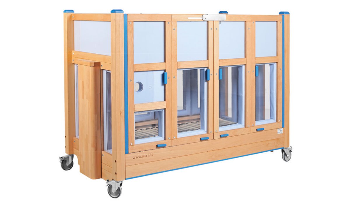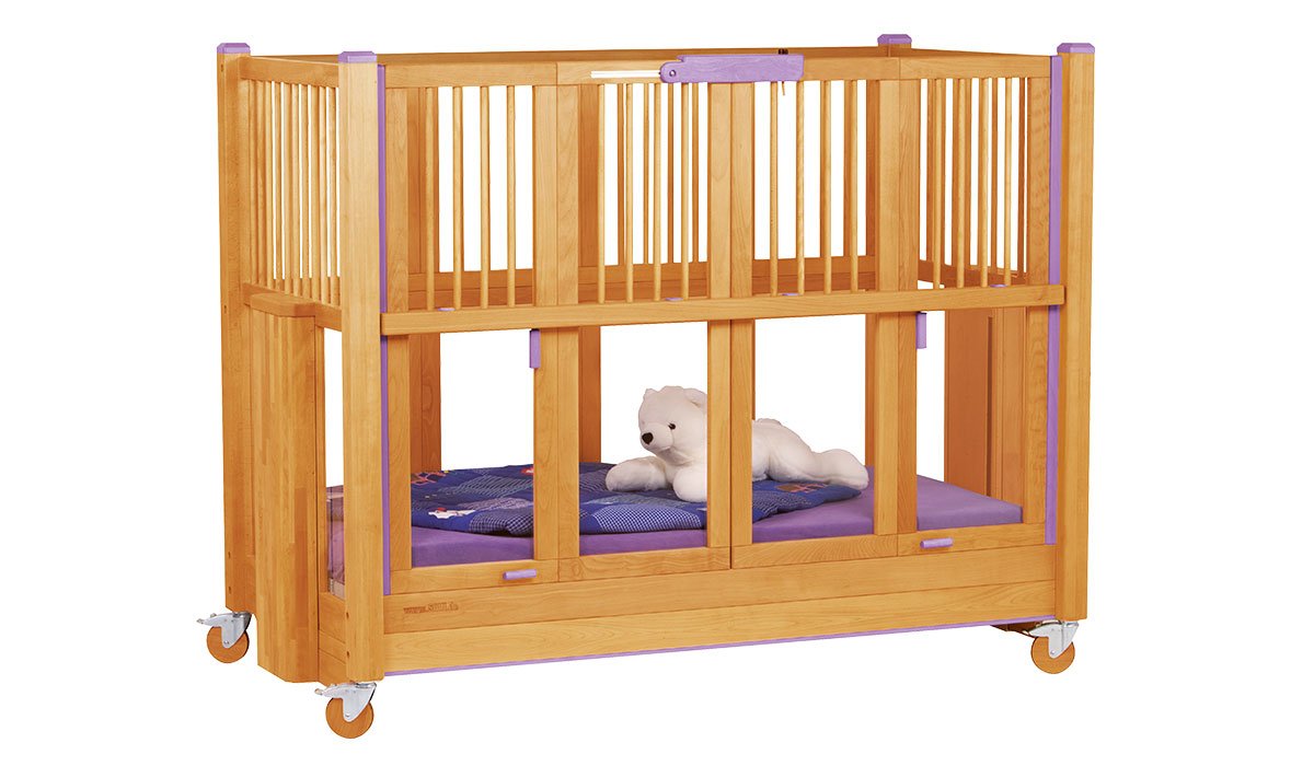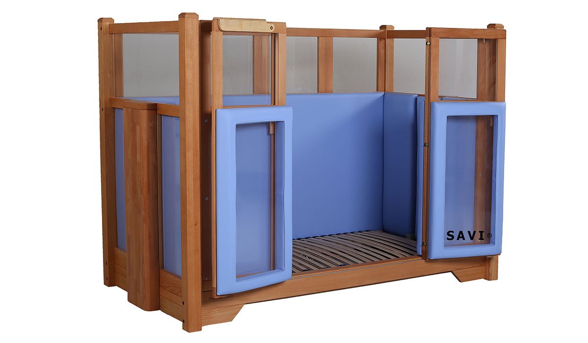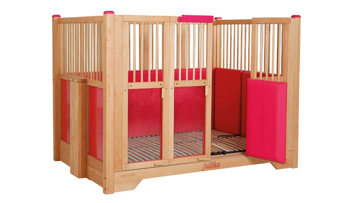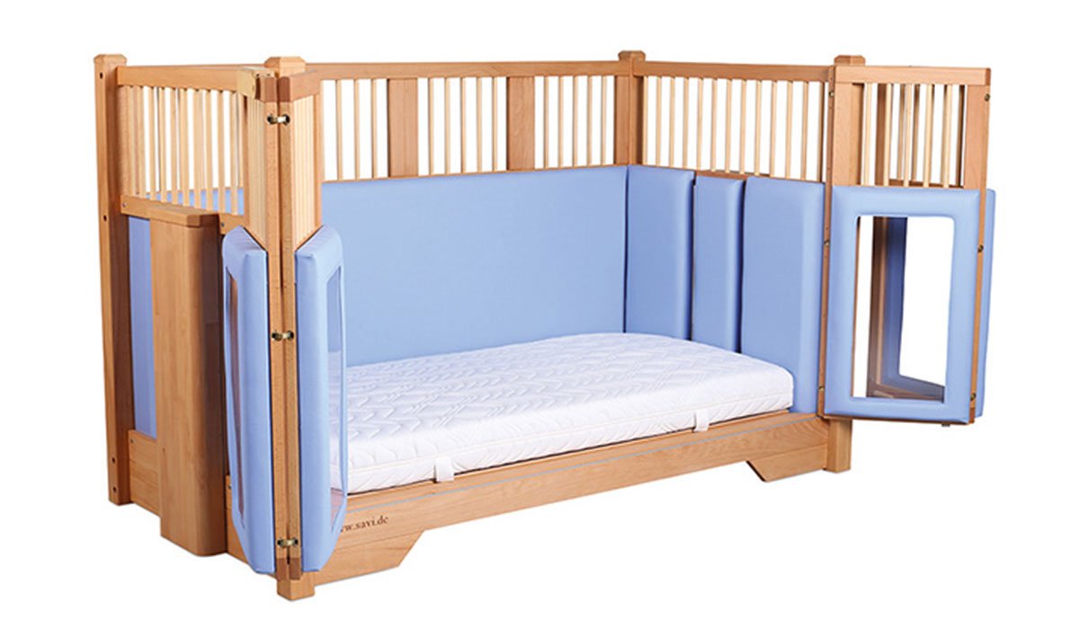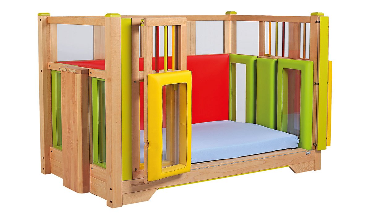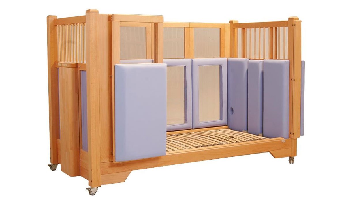 With the four-winged folding sliding door, the barred sides and height adjustment, the Tom special needs bed provides excellent therapeutic support.
